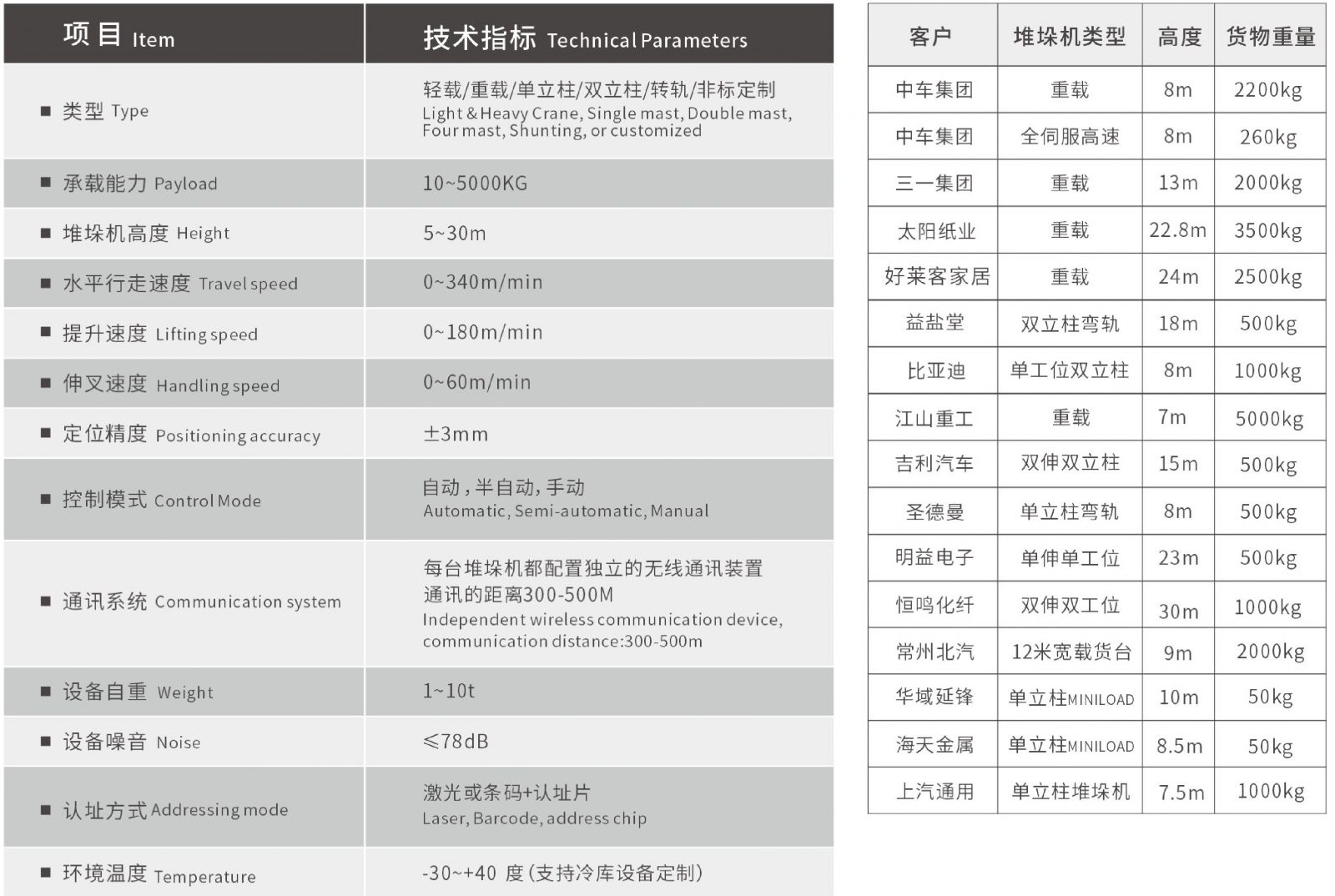 輕載、重載、轉(zhuǎn)軌、單立柱、雙立柱、低溫、防爆等,多種不同規(guī)格的堆垛機(jī),滿足不同客戶實(shí)際需求。目前投入使用項(xiàng)目最高堆垛機(jī)達(dá)到40米,承載50KG-5T。